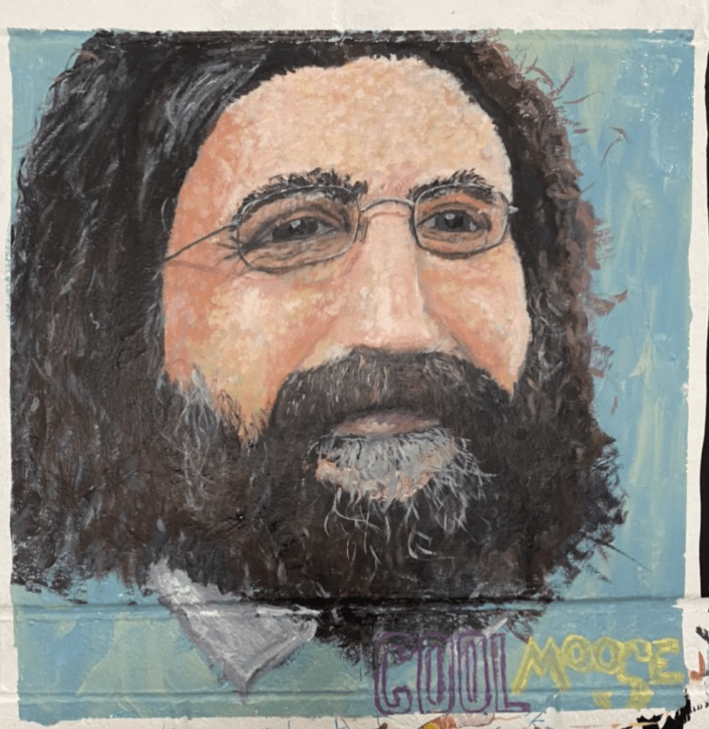 Painted with acrylic paint on a cement wall in the List stairwell, this piece depicts the late Cool Mouse Robert Healey. Healey represents a fascinating character in Rhode Island politics, running for Lieutenant Governor in 2010 with his “Cool Moose Party” on a platform to “abolish the office’” and receiving 39% of the vote. More recently, Healey ran for Governor in 2014, receiving 21% of the vote. Though passing in 2016, the legacy of his eccentric personality, and vehement opposition of establishment Rhode Island politics, will go down in history. As a Rhode Island native with a keen desire to understand my home’s history as well as shape its future, I find characters like Healey exceedingly worthwhile. This man opposed everything the entrenched political establishment ascribes to in Rhode Island, and was widely adored for his peculiarity. I cherished the opportunity to prolong his memory in a small way at one of Rhode Island’s prized institutions, Brown.