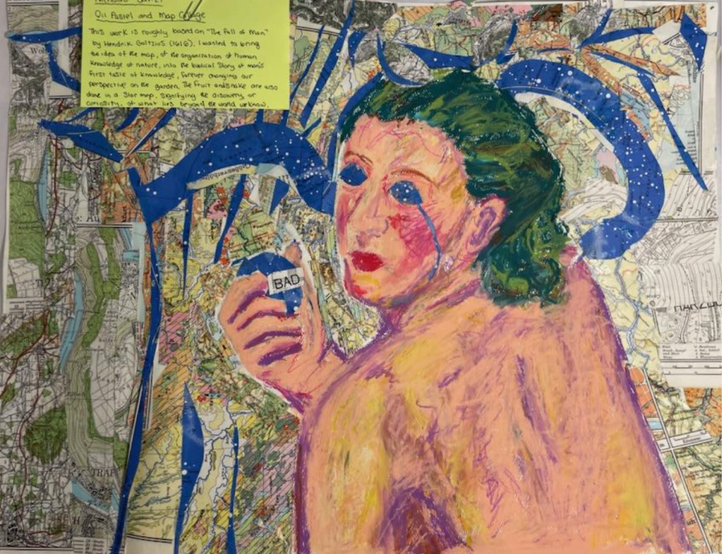 This work, created with collage of German street and star maps, is roughly based on “The Fall of Man” by Hendrik Goltzius. The image is the first woman Eve, as she picks fruit from the tree of knowledge at a serpent’s behest. She turns back with teary eyes that match the complexion of the dastardly things God warned her away from.I am not entirely sure why the story turned so Biblical in this piece. I started out wanting to practice my portrayal of figures, and felt an epic moment of human religious history a good choice. Looking back however, I had actually read the genesis story in a Bible study a few weeks earlier. This discussion arose about the relationship between the serpent and Eve. Was it truly Eve’s fault that the serpent had deceived her? And at the end of the day, what was her sin in eating from the tree of knowledge? Curiosity? The use of maps as a collage for the background yields a great deal of interpretive value. Especially the contrast between the organization of human knowledge and civilization in the street maps, and the deep abyss of the constellations in the star maps. Perhaps looking out to the stars, beyond the life of work and pay is the true freedom. Perhaps also this is a step we all must take to be truly human. Even though street maps of our lives tend to label the forbidden fruit as “Bad,” this is the fruit that is usually the sweetest.